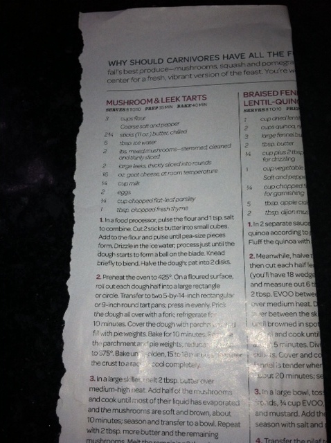 I saw this recipe in Rachel Ray’s monthly magazine. It has a few steps so be prepared. Make the crust and cook it in advance. Then saute the mushrooms and leeks (separately). Cool the crust and make the egg, cheese, milk mixture. Assemble and cook! This was delicious! Give it a whirl.