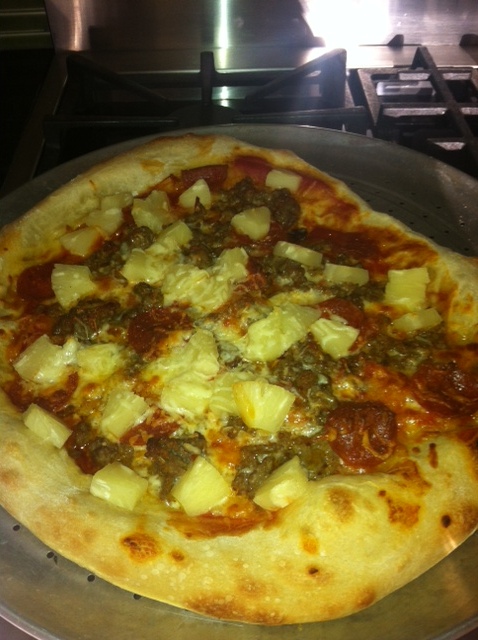 I made two veggies, one pepperoni and sausage and one pepperoni and pineapple. An added bonus was that it was so nice, we got to eat outside!