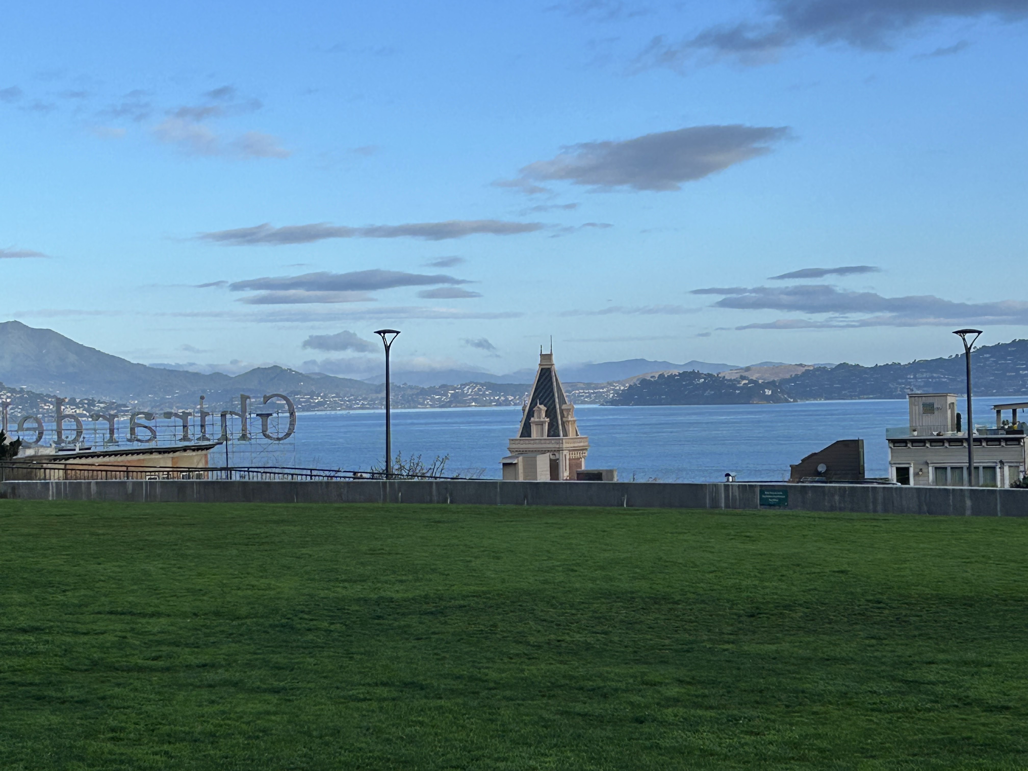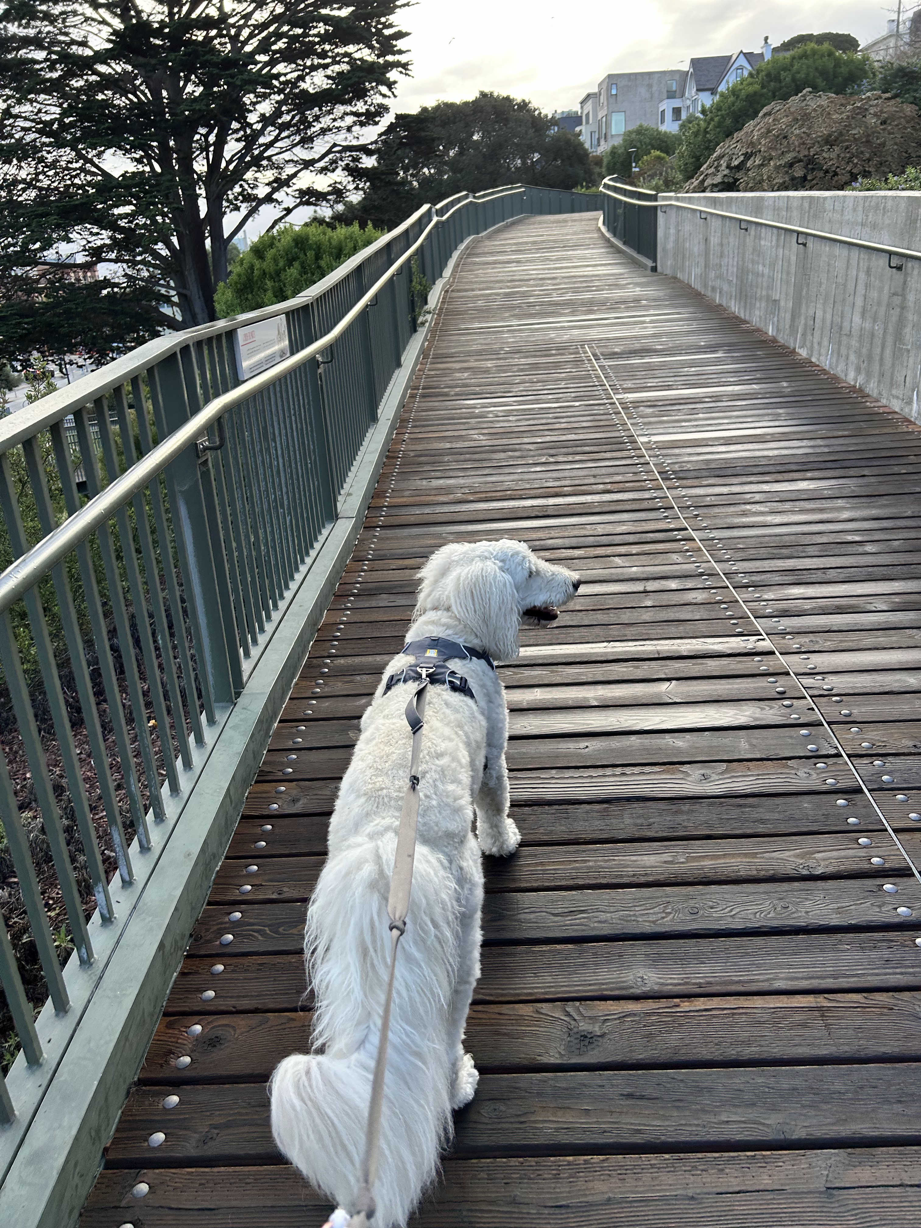 San Francisco is generous with her beauty. I have been traipsing through neighborhoods all while enjoying the breathtaking views of the Pacific Ocean. Yes, the hills make for great workouts but they also pitch me to great viewpoints. Pete and I have established our walk routine and he insists on at least one daily visit to the Francisco dog park to meet with his new pals and one visit to the valets at the Fairmont for his nightly treat. It’s a routine I can live with.