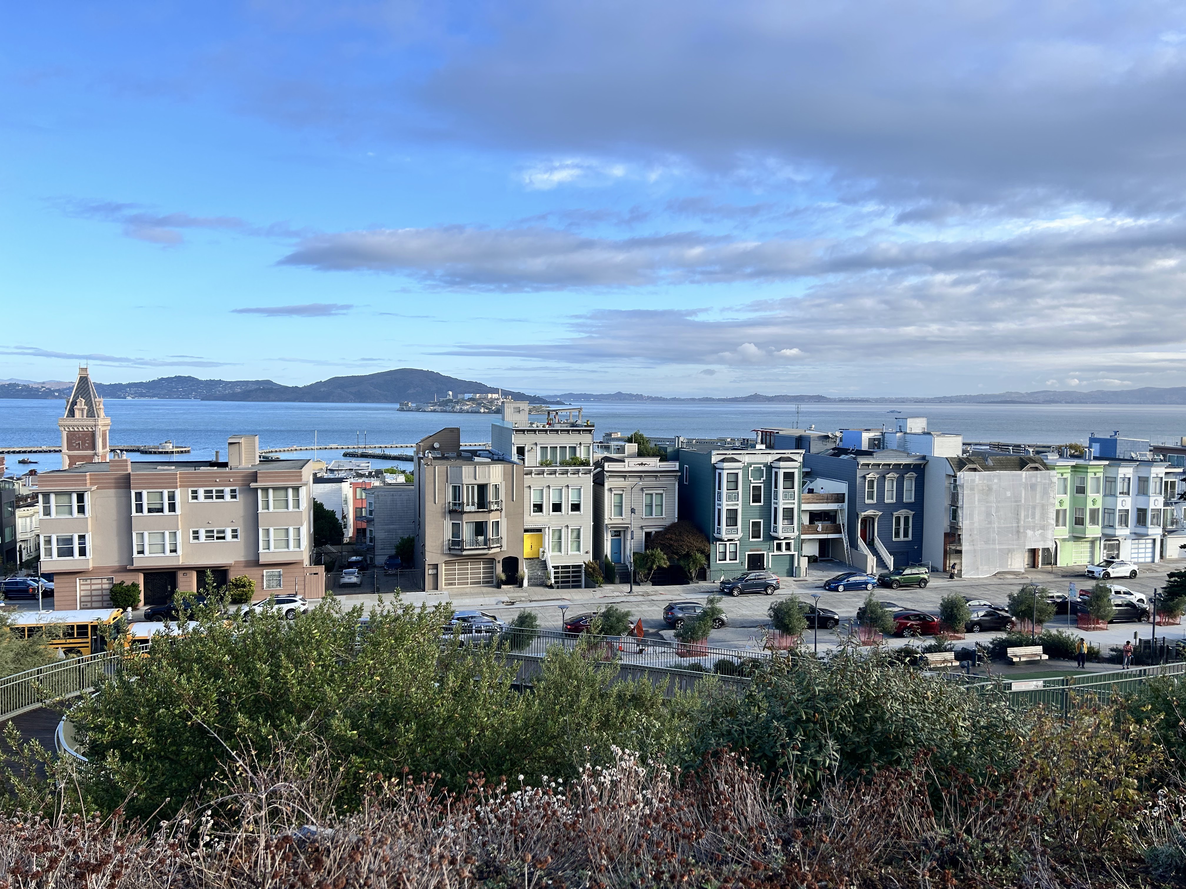 My short term rental is on the path of the cable cars so I hear the bells all day and see the delight as the numerous tourists hold onto the railing and swing halfway off the wooden steps. It’s a quintessential San Francisco vision. The noisy underground cables in the street scare Pete so we walk quickly when crossing.