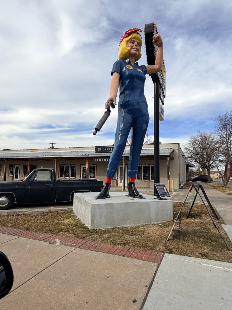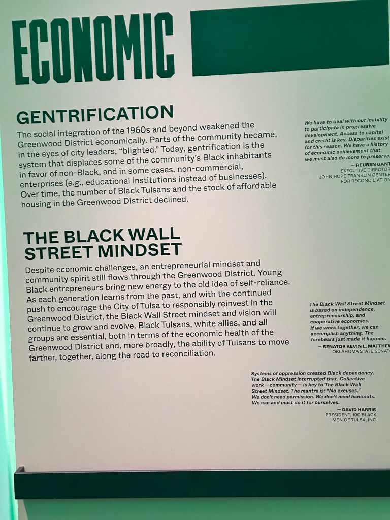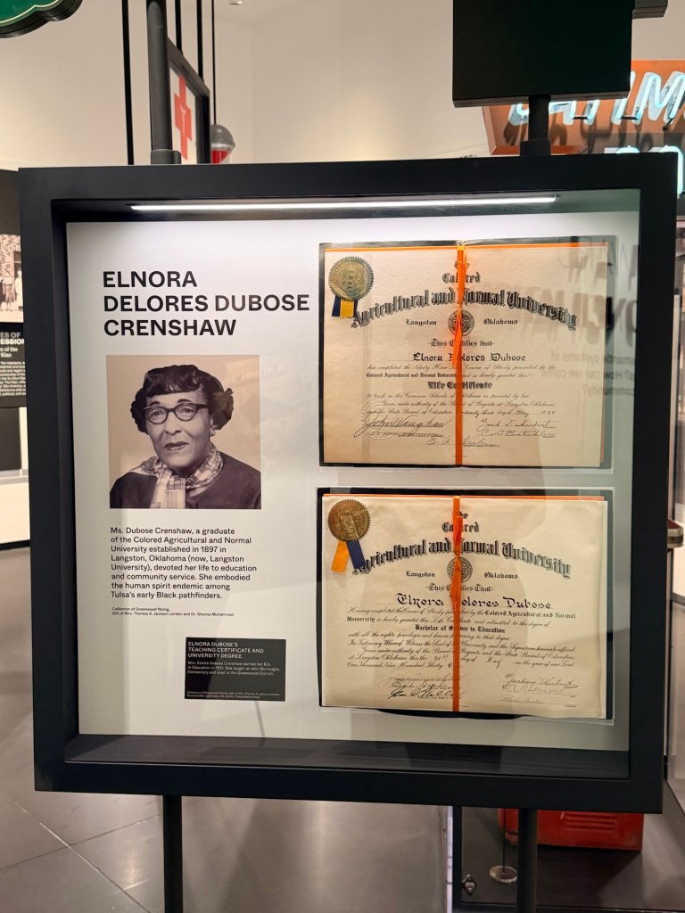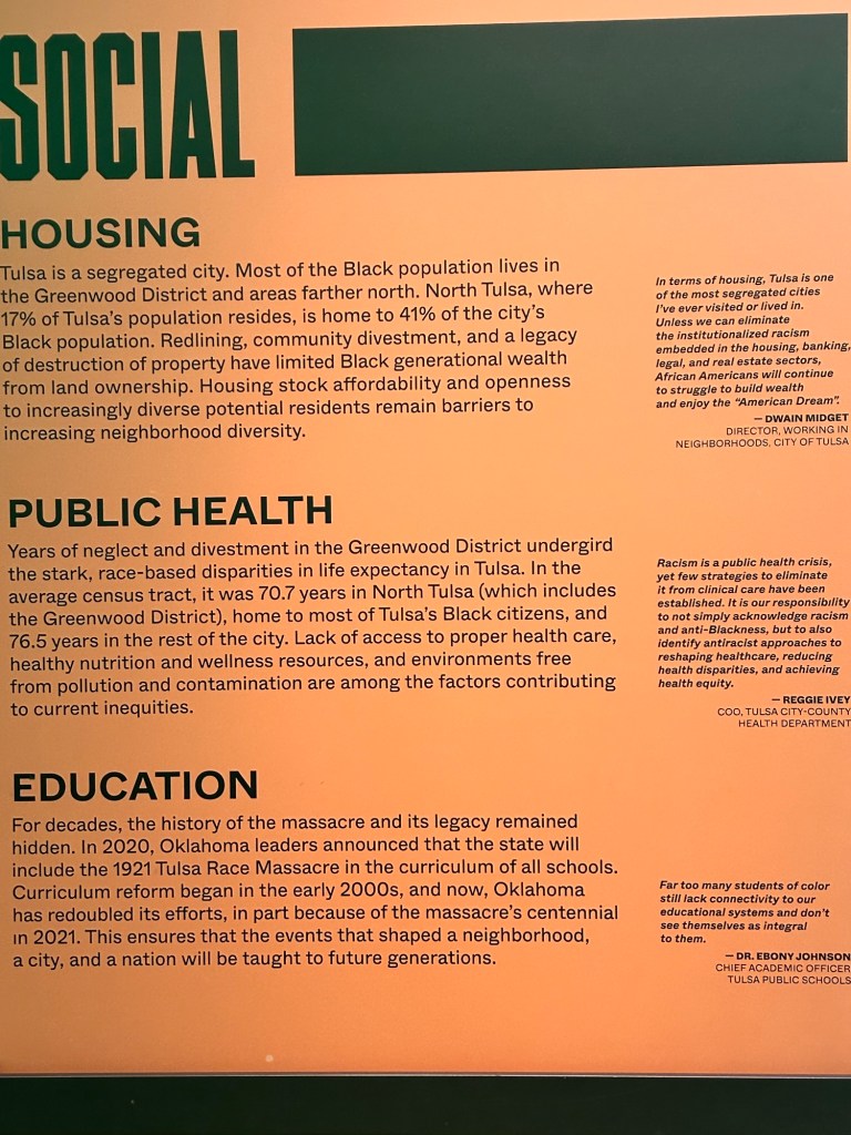 Today I drove about an hour and forty-five minutes to Tulsa. I went to the Greenwood Rising Black Wall Street History Center in Tulsa. It shared the story of Greenwood as a successful enclave of Black business until the Tulsa Race Massacre in 1921. This museum created an immersive experience. My favorite was the barbershop where I was able to sit in the barbershop chair and watch holographic barbers talk about early dreams for Greenwood.