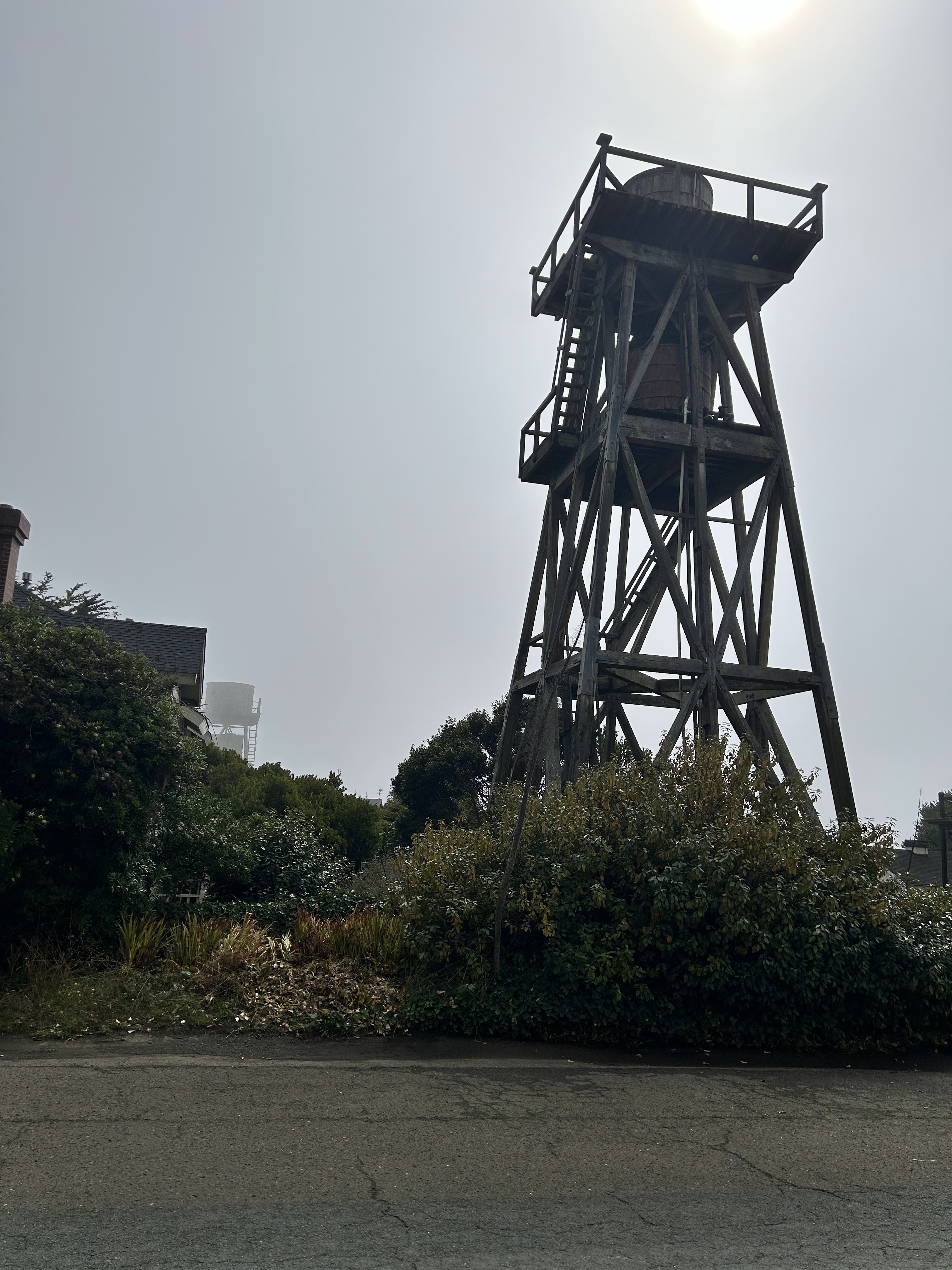 We passed through Fort Bragg and returned later to have lunch at Sea Pals (more fish and chips) and walk at MacKerricher State Park and Glass Beach. But before that we wandered the Mendocino downtown area. It’s a quaint downtown right on a cliff overlooking the Pacific Ocean with water towers sprinkled throughout the town. I stopped at the visitor center to learn a little history. The town (unincorporated) still uses them today since the source of water is wells. The towers are now powered by electricity. Mendocino can be sunny one minute and then the fog rolls in and visibility is nil. Pete and I are ready for a nap!