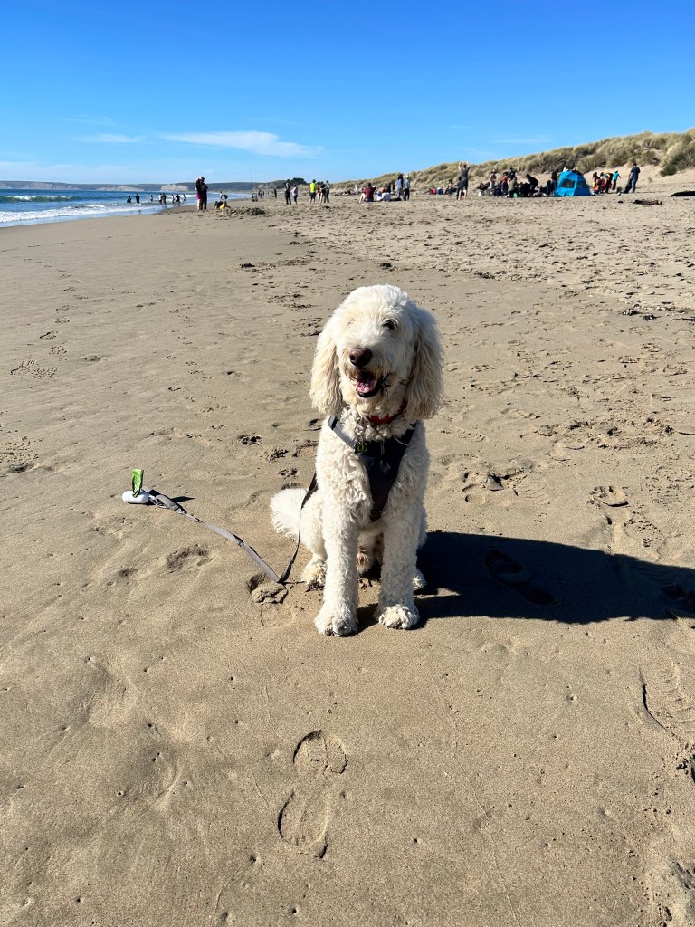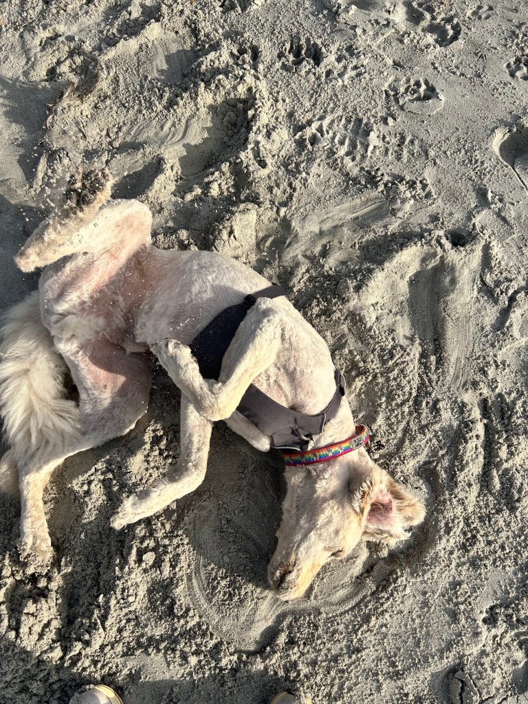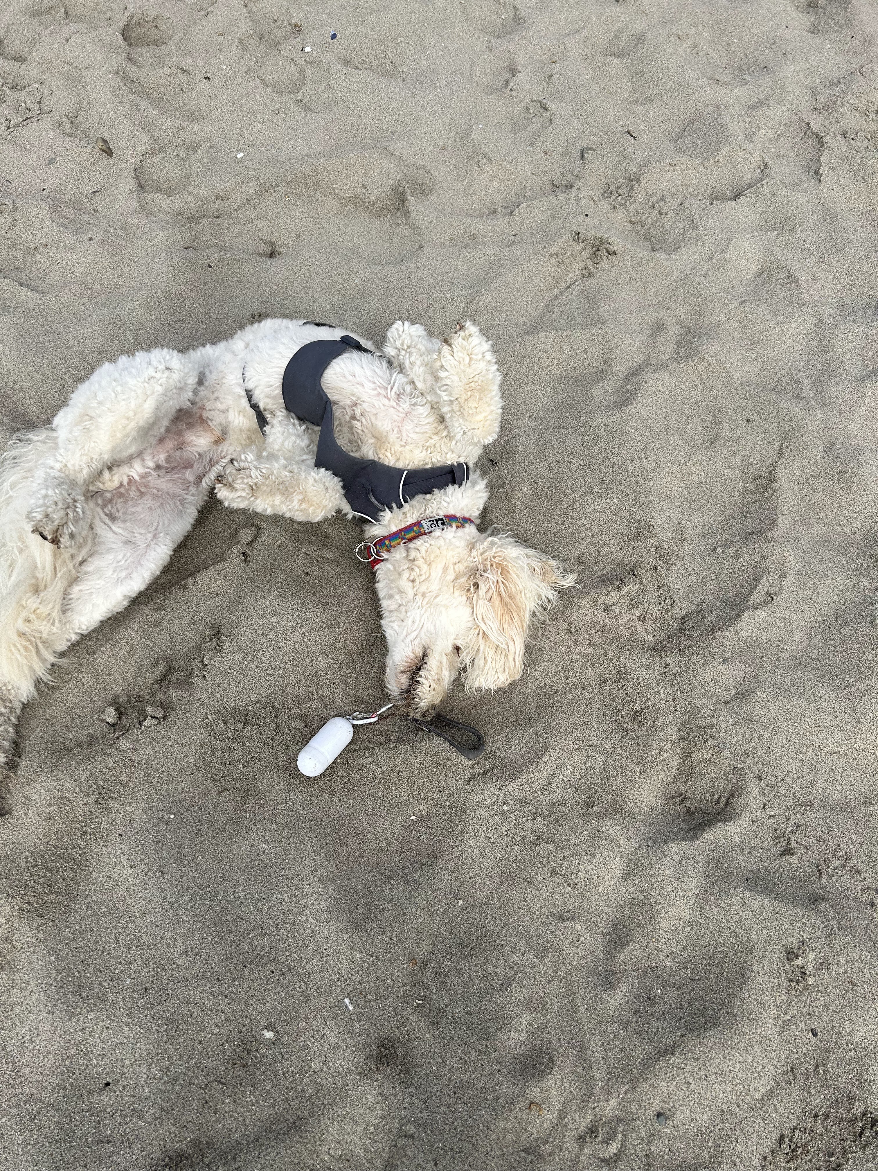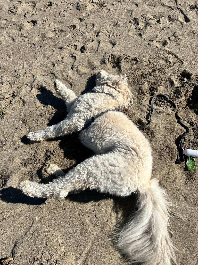 Next up, Limantour Beach. A easy walk through beach grass lands us on a long length of sandy beach. Tons of families playing, picnicking and running their kites litter the beach. Dogs are allowed on the south end of the beach so that’s where we go. Pete immediately rolls in the sand with gusto. There is nothing better than a roll in the sand, as far as Pete is concerned!